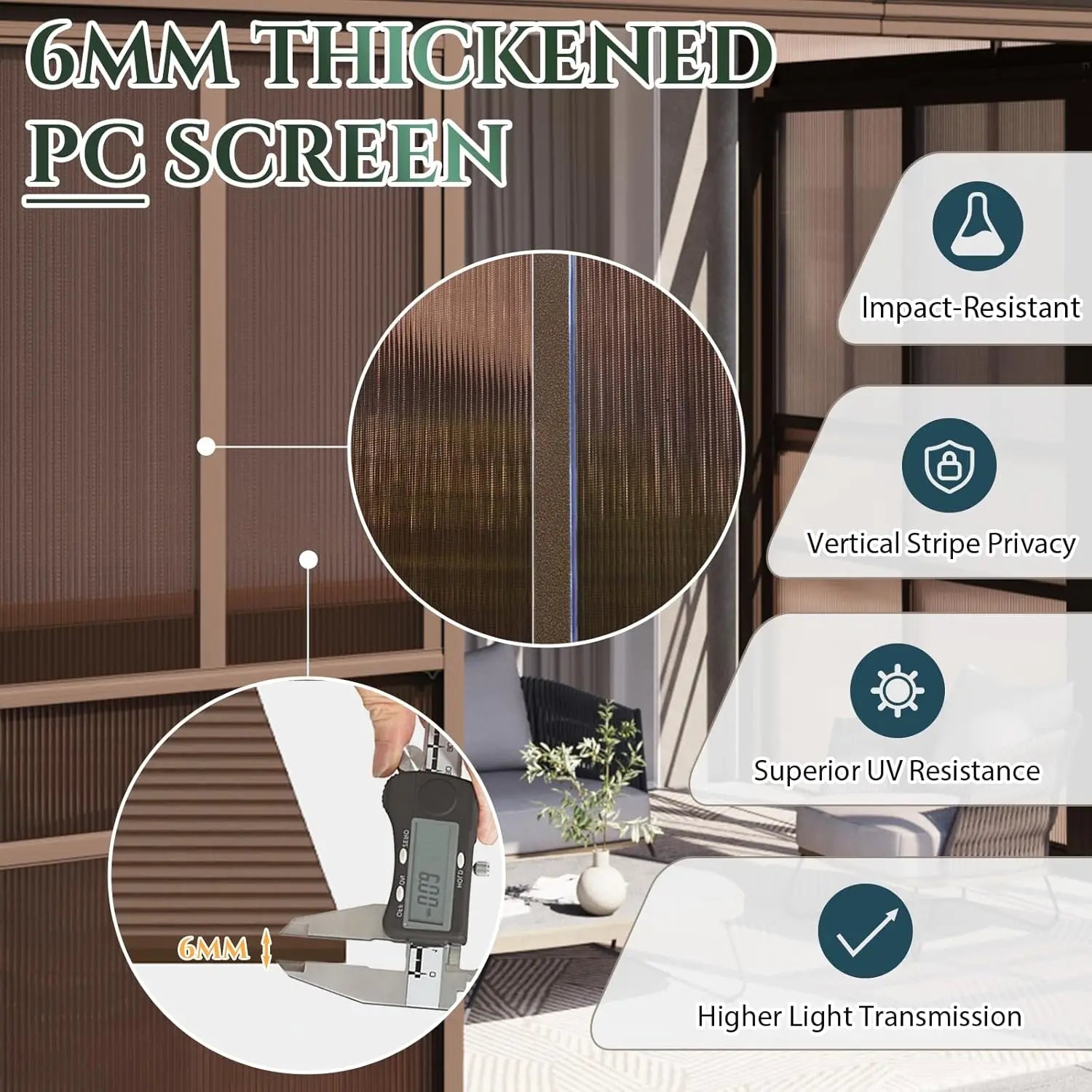 - Premium 6mm textured PC panels: These thicker, crack‑resistant panels deliver 99% UV protection, enhanced privacy, and durable clarity through storms and heat.