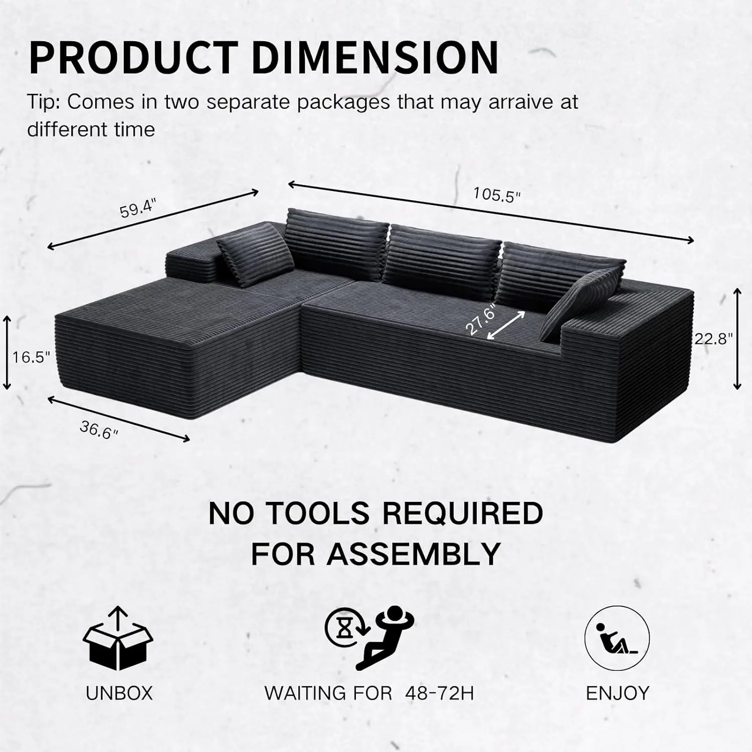 No Assembly Required - Enjoy instant comfort with absolutely no assembly required—just unbox and relax. The modular cloud sofa expands to its full plush shape within 72 hours. Note: For convenient shipping, your order may arrive in 2pcs separately shipped packages