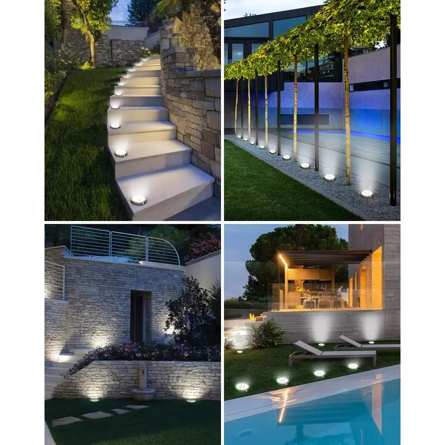Wide Application These solar disk lights outdoor are suitable for a variety of scenes, such as gardens, paths, decks, patios, lawns, sidewalks, steps, landscapes, entrances and swimming pools, ideal for outdoor lighting decoration