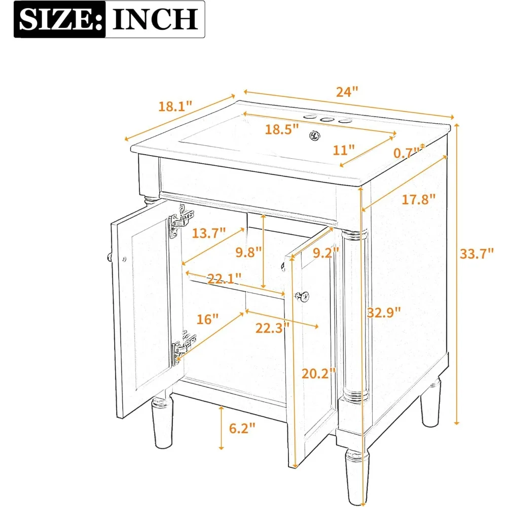 - Perfect Size: Our bathroom vanities mesures 24 inch x 18 inch x 34 inch, Besides, the ceramic sink with 3 holes for most type of faucets. Large opening on the back with U-shaped cutout in the shelf for easy plumbing access.