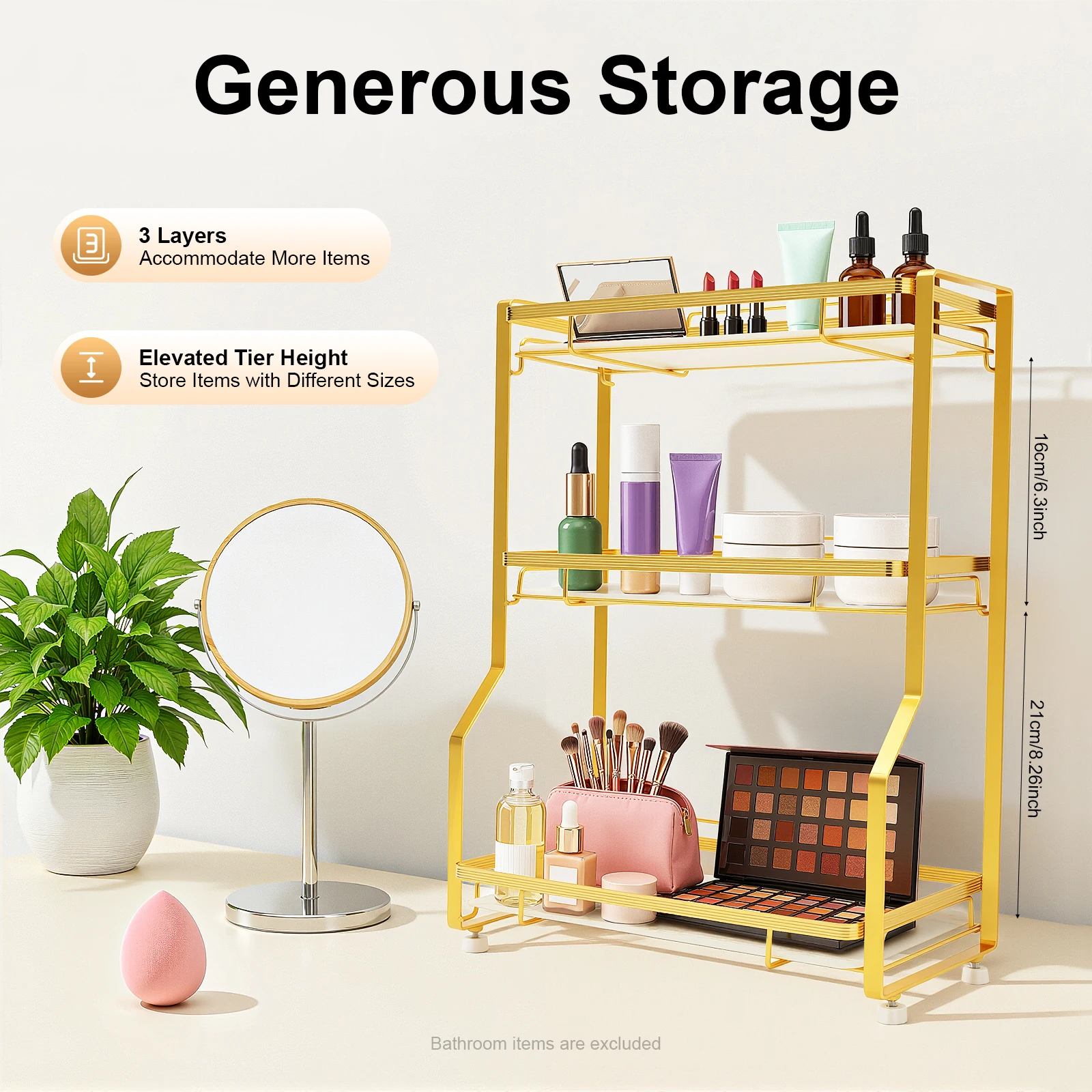 High Storage Capacity: The three-tier design provides you with enough space to store items. The different tier heights (8.16inch, 6.3inch) make it easy to organize and store items of different sizes, keeping your bathroom neat and beautiful.