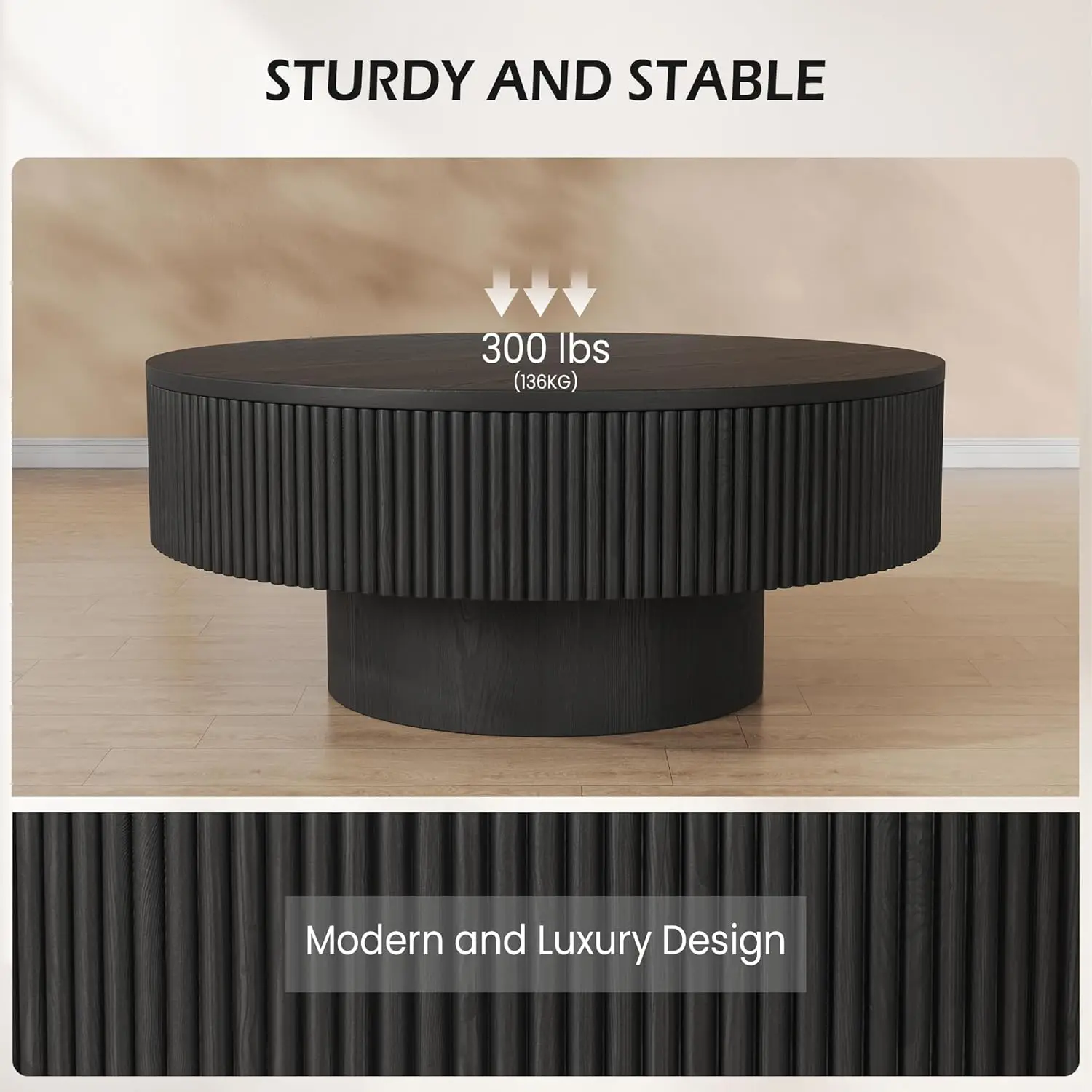31.5” Round Fluted Coffee Table, Modern Wood Circle Coffee Table, Veneer Handcrafted Relief Tea Table with Sturdy Pedestal for L