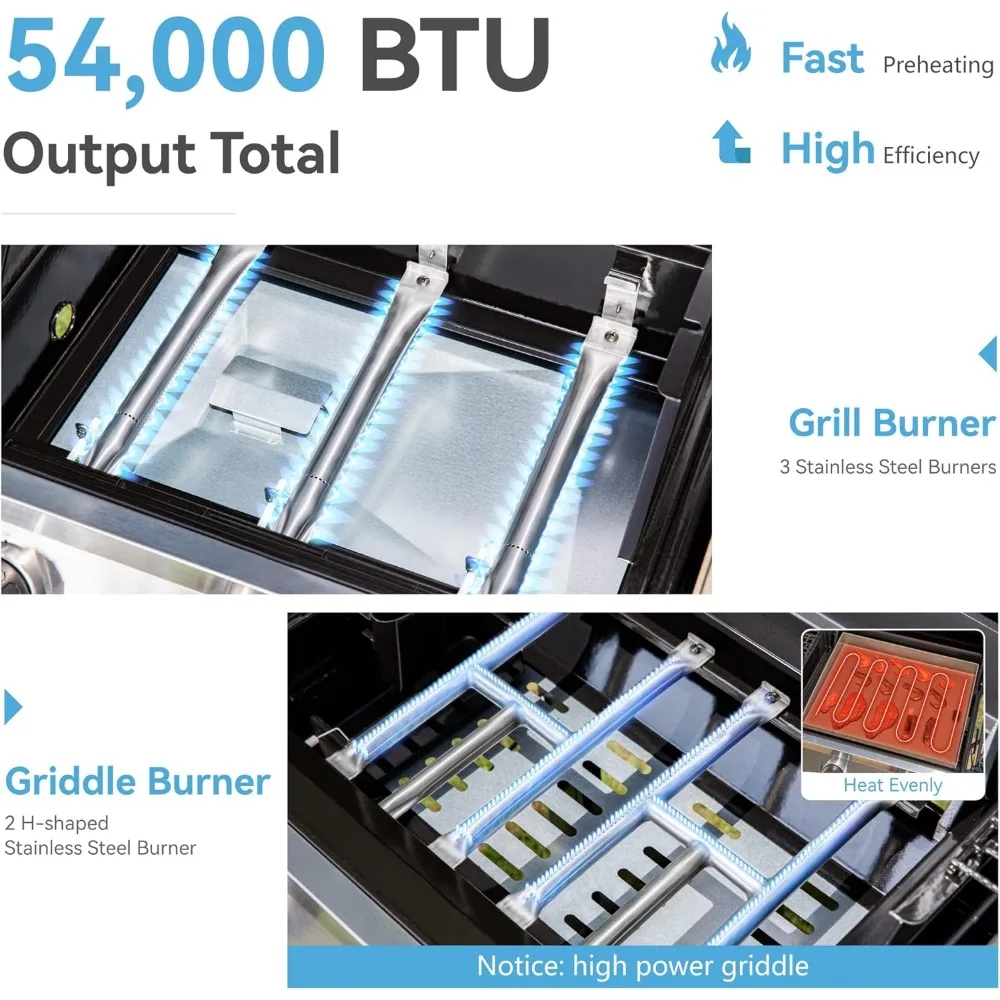 - GRILL AND GRIDDLE COMBO: If you are looking for a better cooking experience, the Propane 5-Burner Gas Grill and Griddle Combo is a convenient and versatile option for outdoor cooking enthusiasts, offering the benefits of both grilling and griddling in one unit. Its sturdy construction and thoughtful features make it a practical choice for backyard barbecues, camping trips, tailgating, and other outdoor events