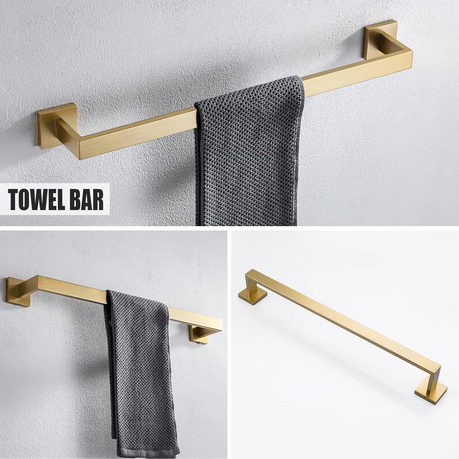 Upgrade your bathroom with this elegant and durable 5-piece hardware set, designed for both style and functionality. Perfect for American homes, it combines modern aesthetics with high-quality materials to enhance any space. Key Features: - Complete Set: Includes 1 towel bar (23.6 inches), 1 toilet paper holder, 1 towel ring, and 2 coat hooks. Comes with all necessary mounting screws, anchors, brackets, and clear installation instructions for easy setup. - Premium Material: Made from SUS304 (18/8) stainless steel with added chromium/nickel content to ensure rust-proof and corrosion-resistant properties. Ideal for humid environments like bathrooms and kitchens, offering long-lasting durability. - Modern Design: Features a brushed gold finish that adds a touch of sophistication. The unique square shape and concealed mounting holes create a sleek look with invisible screws after installation, maintaining an elegant appearance. - Easy Installation: Each piece is pre-assembled—no additional assembly required. Simply use the included hardware to mount securely on walls in minutes. Benefits: - Enhances bathroom organization by providing dedicated spaces for towels, toilet paper, and coats. - Withstands moisture and daily use without tarnishing or rusting. - Adds a contemporary flair to your decor while being practical for everyday needs. Ideal For: Homeowners looking to refresh their bathroom or kitchen with reliable accessories that blend seamlessly into modern interiors. Suitable for DIY enthusiasts due to straightforward installation. Customer Assurance: We stand behind our products with dedicated support. If you encounter any issues, our team is ready to assist promptly.