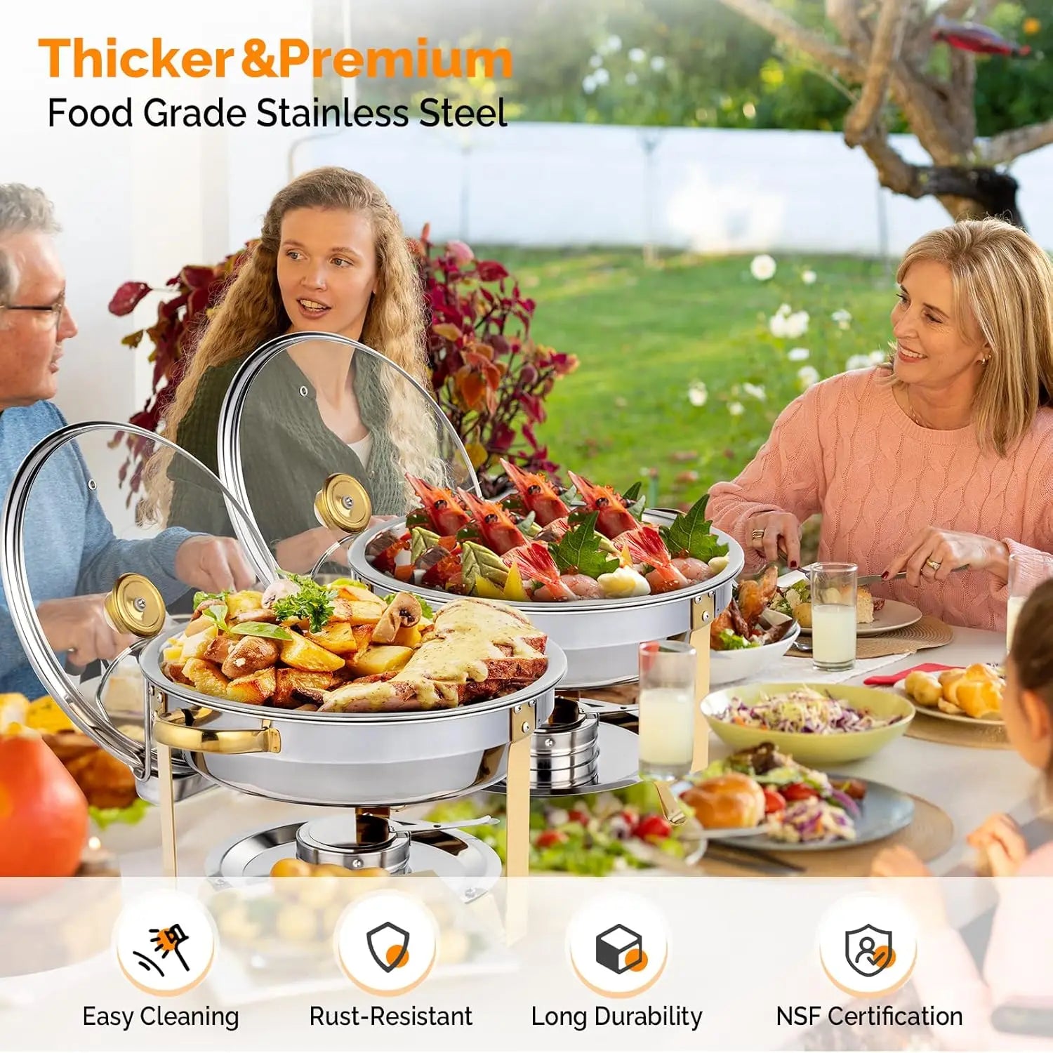 - Elegant, heavy-gauge stainless steel with a mirror finish and gold-accent handles and legs adds a premium look to buffets, parties, and weddings.