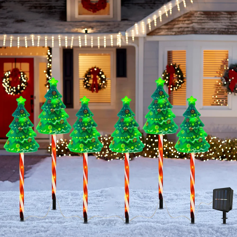 6 Pack Solar Xmas Tree Light 6 Modes LED Solar Powered String Lights USB Rechargeable Xmas Tree Candy Cane Light for Garden Lawn