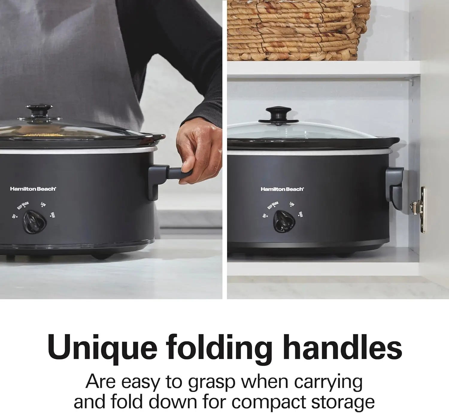 - Folding, full-grip handles lift for carrying and tuck away flat to save counter space; ergonomic design keeps heat away from your hands and the lid secure during transport.