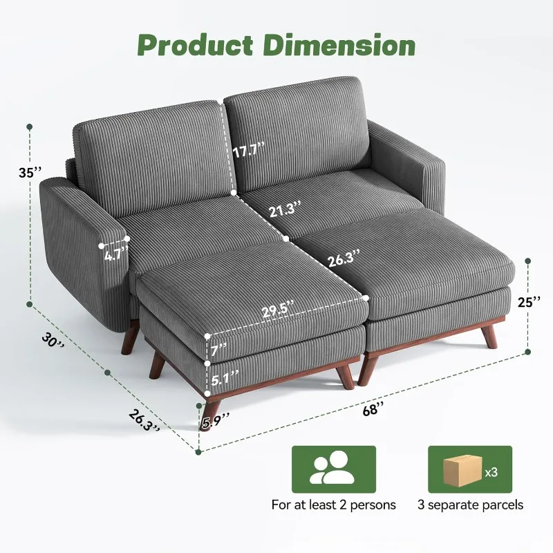 68" Loveseat Sofa with Movable Ottoman, Comfy Corduroy Couch with Spring Cushion, Sofa Couch with Solid Wood, Modern O