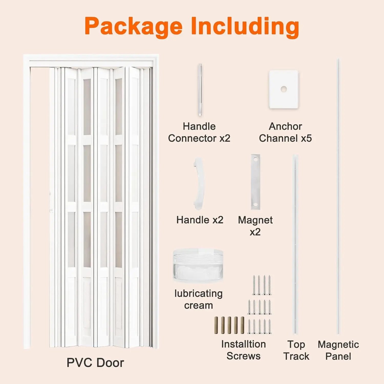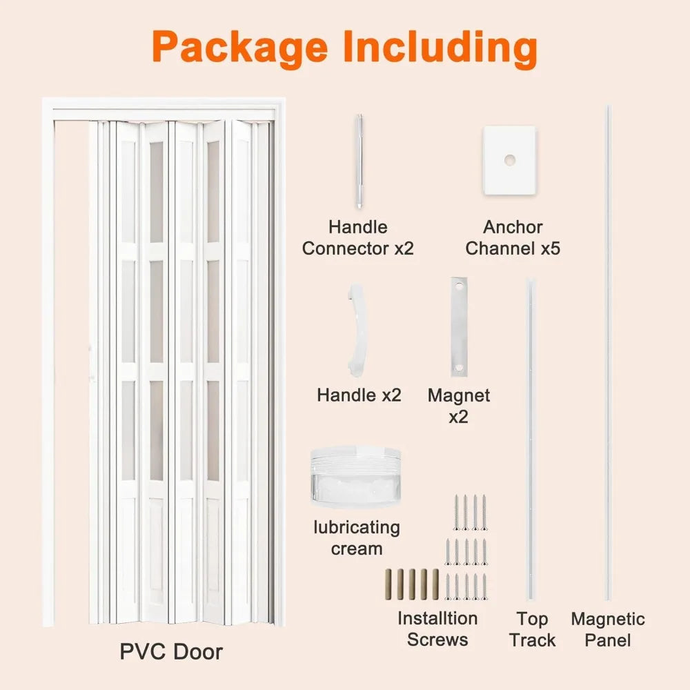 【Premium Quality and Eco-Friendly Design】Experience superior durability with our accordion folding door made from non-leaded, odor-free PVC vinyl. This sturdy material is easy to clean with a damp cloth, making it perfect for households with children or pets. Enjoy peace of mind knowing it's safe and environmentally friendly. 【Versatile Application for Any Space】Our waterproof accordion door is ideal for multiple settings including bathrooms, kitchens, laundry rooms, RVs, campers, basements, walk-in closets, storage areas, or as a stylish room divider. The door panel measures 72" x 80", with adjustable width by cutting the track to fit doorways from 61" to 72". Height can be customized by trimming the door panel itself for a perfect fit. 【Complete Hardware Set for Effortless Installation】Everything you need is included in one package: door panel, handle, and a comprehensive hardware set. Featuring upgraded wheels and strong magnetic blocks for smooth operation and secure closure. Our easy-to-follow instruction manual ensures quick and hassle-free setup in minutes. 【Space-Saving Innovation】Maximize your usable space with our innovative accordion design that folds compactly to provide over 90% doorway opening efficiency. Ideal for unobstructed access and easy passage in tight areas like closets or pantries. Transform any room into a more functional and clutter-free environment effortlessly. 【Sleek Style That Complements Any Decor】Boasting a minimalist profile that suits all home decor themes—from modern minimalist and industrial to classic farmhouse and bohemian. Its neutral white color blends seamlessly with existing color schemes while offering customizable options through trimming adjustments. 【Enhanced Features for Superior Performance】Enjoy upgraded rollers that ensure quiet sliding action without sticking or jamming; handles designed ergonomically; plus complete hardware including screws necessary during assembly process so no additional purchases required! Perfect solution whether looking replace old doors create new partitions within living spaces quickly efficiently.