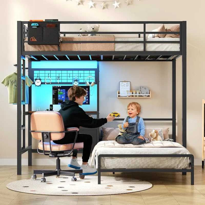 Bunk Bed with Desk,Led Lights and Charging Station Metal L-Shaped Twin Over Twin Bunk Beds with Storage Drawers and Shelv