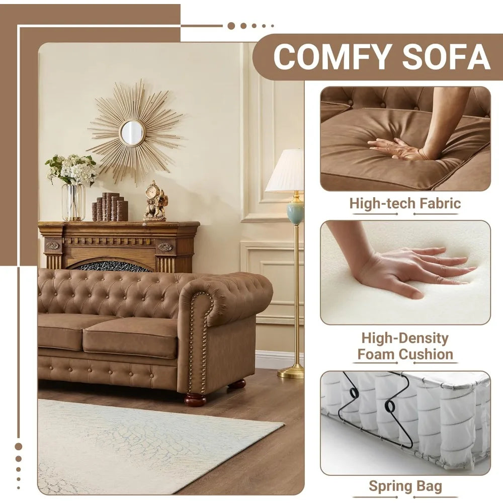 - 【Luxury and Elegant】This leather chesterfield sofa is designed in the traditional chesterfield style, with tufted deep buttons, nailhead trim, curled arms and wooden legs. The exquisite retro look can add an elegant touch to any room, creating a rich and luxurious visual effect. The living room couch offers unparalleled comfort, making it the perfect centerpiece for your living room, apartment or office