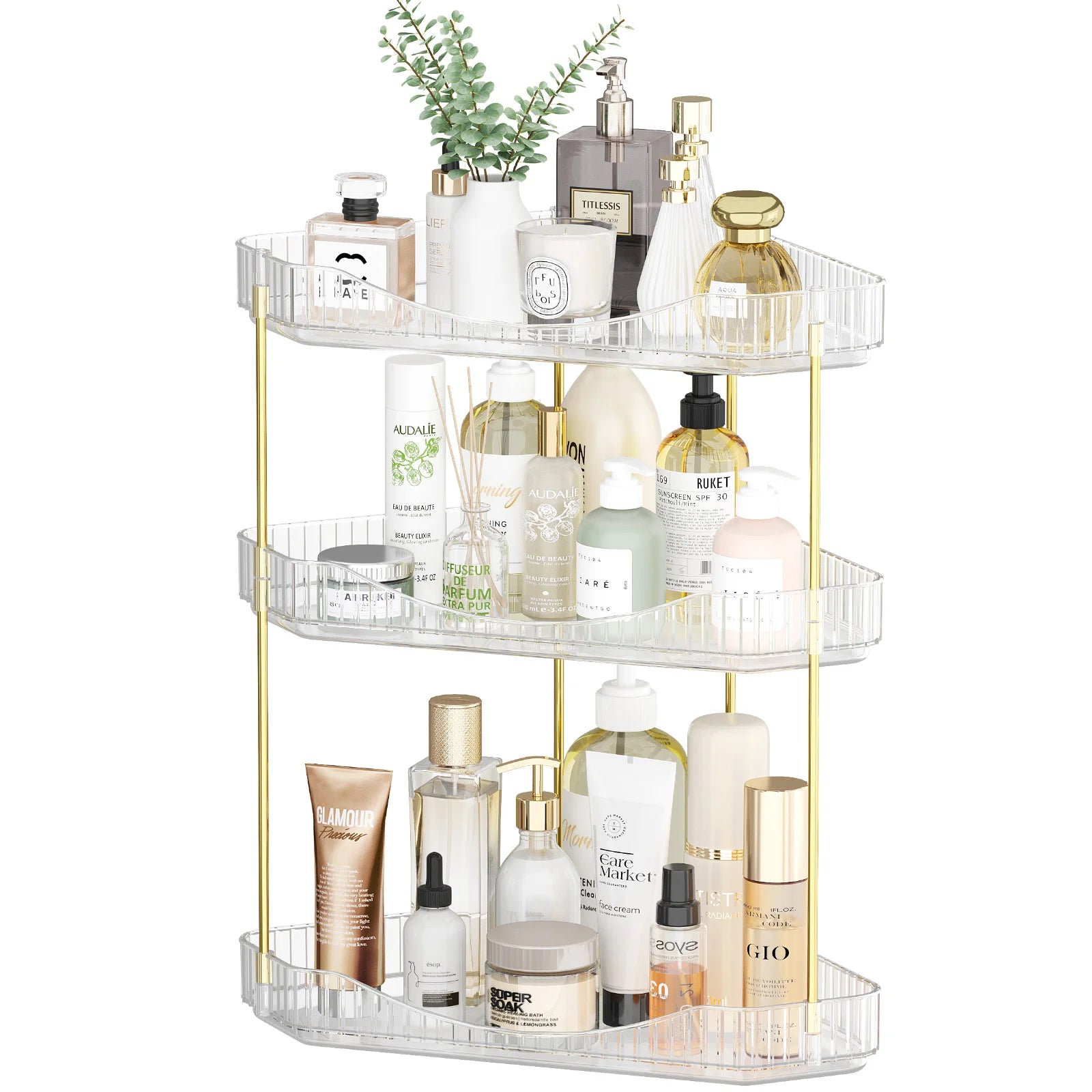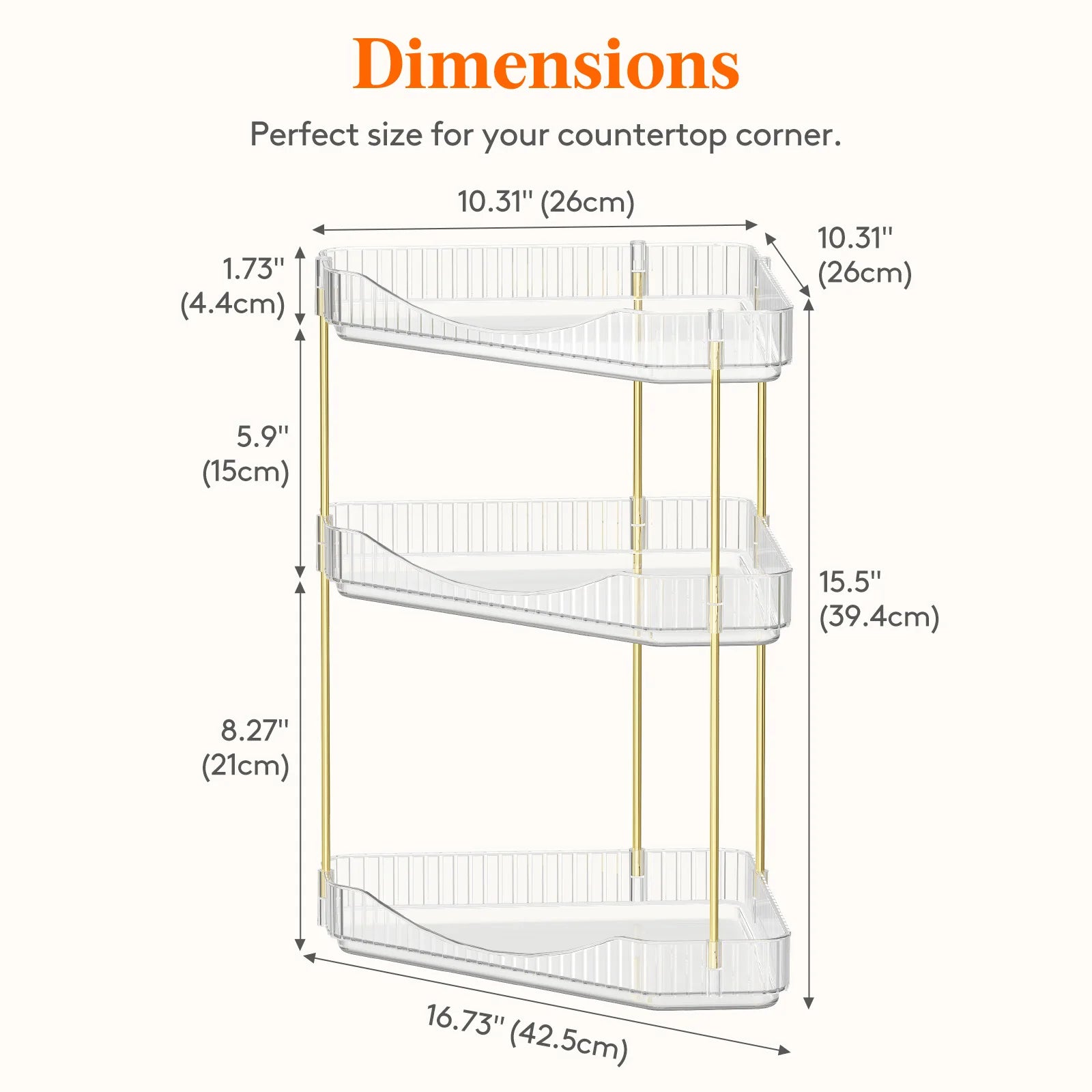 Maximize your corner space with a dual-tier plastic countertop tray that keeps your bathroom essentials neatly organized.