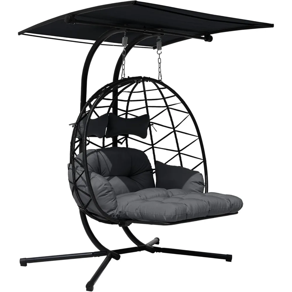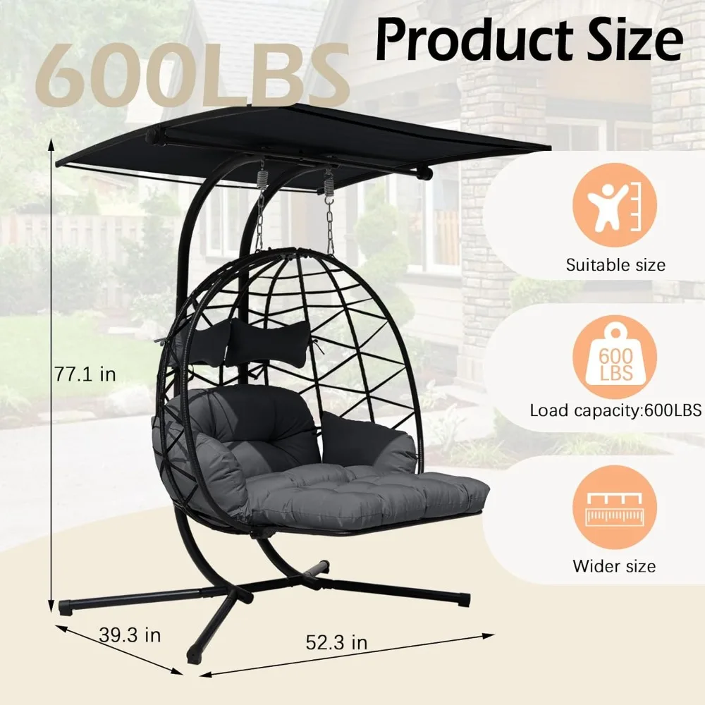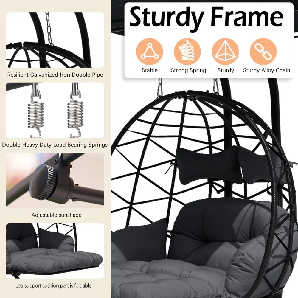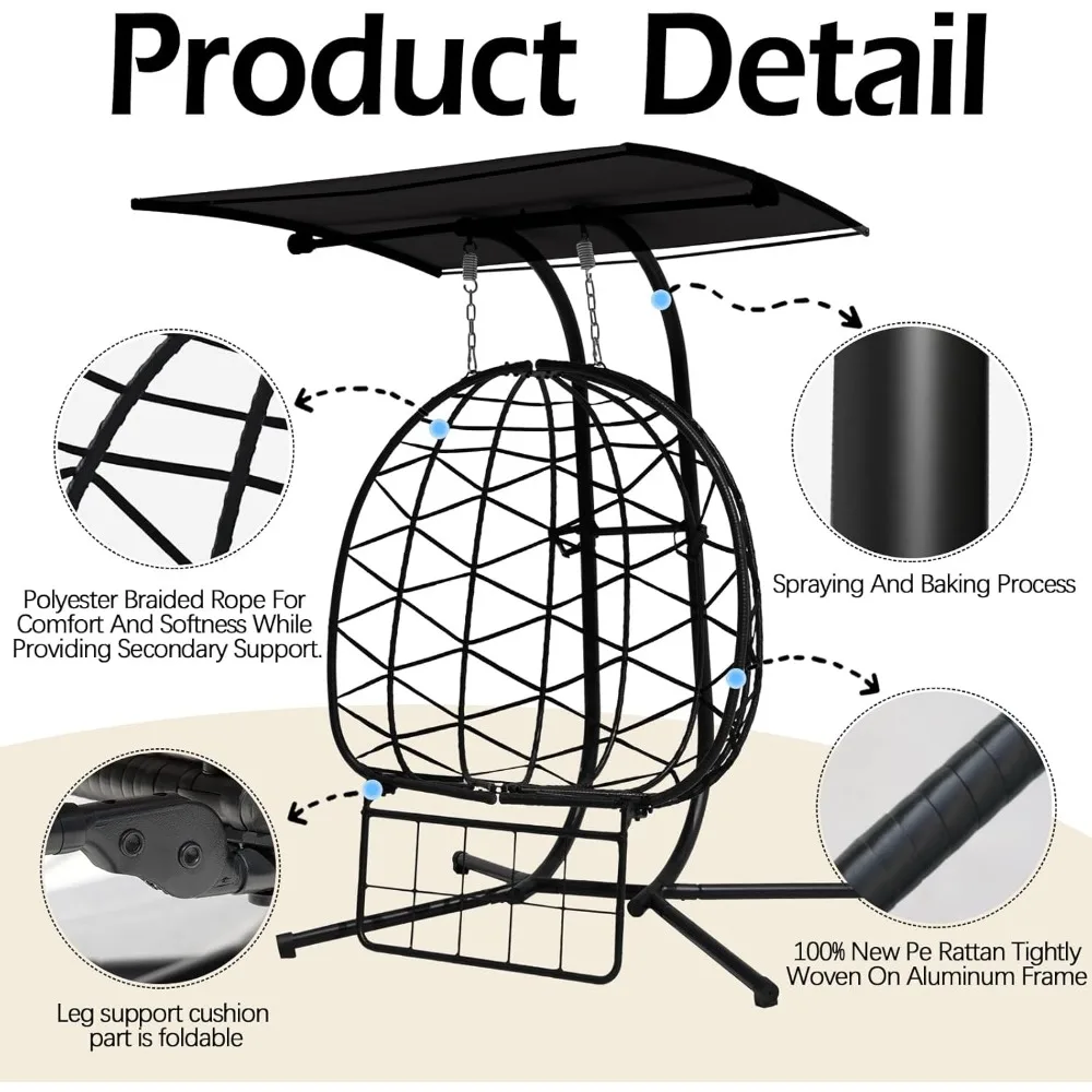 Double Egg Chair Outdoor With Stand & Adjustable Canopy, Extra Large 2 Person Patio Egg Chair With Leg Rests, Hanging Swing Chai