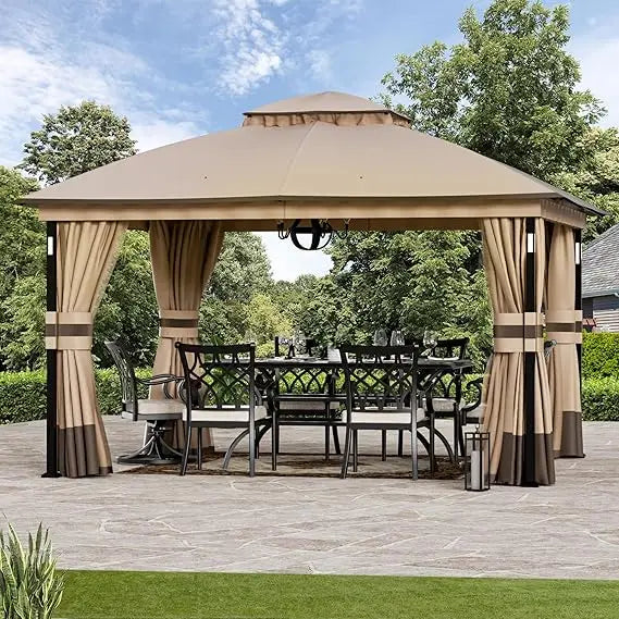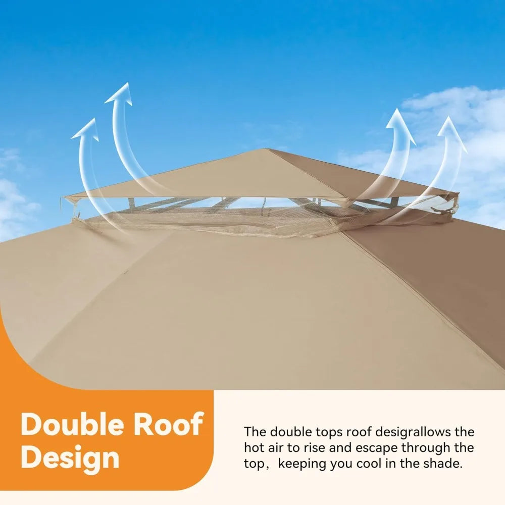 - Durable, weather-ready design: rust-resistant iron frame, water-resistant polyester canopy, and a double-layer roof that promotes airflow, reduces heat buildup, and guards against sun, rain, and snow for dependable outdoor use.