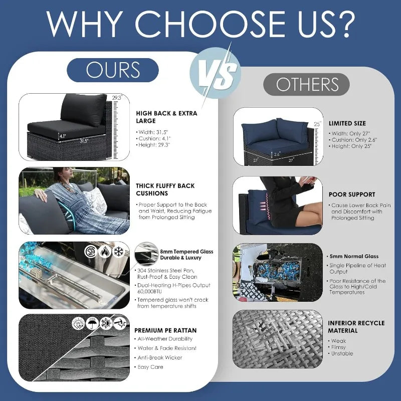ALL BEST MATERIALS MADE: Experience luxury and modern appearance with our wicker collection sofas, designed with premium PE material that can withstand all weather conditions; The robust metal frame, thick and heavy-duty, ensures a high weight capacity; Our sofas blend sturdiness and comfort perfectly, providing a strong yet cozy lounging experience designed for the most exquisite tastes