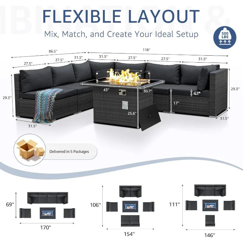 SET INCLUDED: This elegant 7 Pieces modular luxury patio sofa set in grey colors with 6 seatings includes one fire pit table, two Corner Chairs, and four middle chairs, in addition, we also put 1 pc table cover, 1 set wind guard, and 18 lbs glass beads in the fire table box
