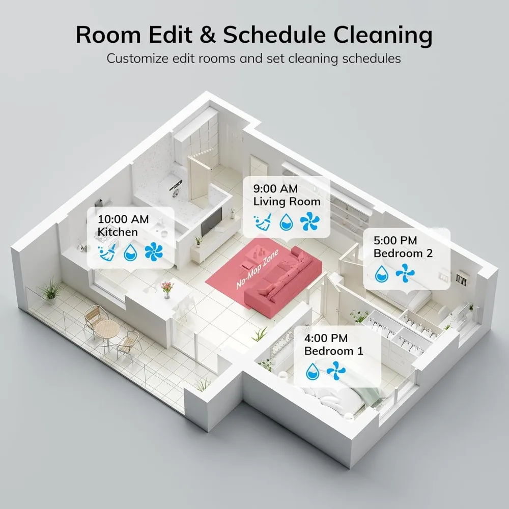 Smart ILIFEClean App Control: Control the A12 Pro vacuum robot effortlessly via the ILIFEClean App. You can customize no-go zones and no-mop zones, set up virtual walls, cleaning schedule, select rooms or areas to clean, and adjust the water level and suction power according to your specific cleaning requirements. This makes smart cleaning a breeze (Note: It only supports 2.4GHz WiFi network)