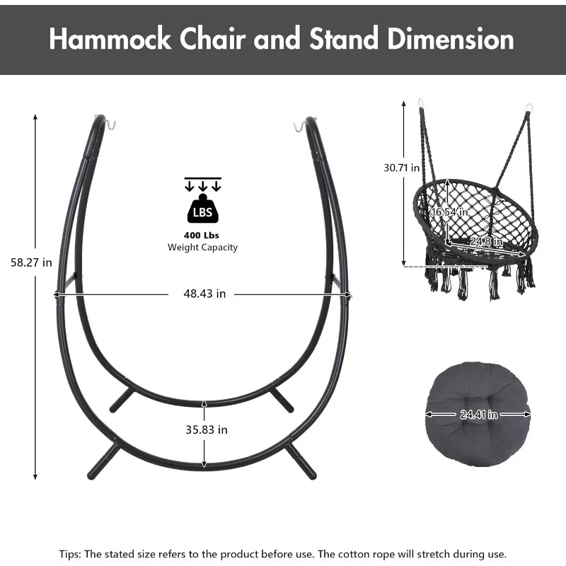 OVERALL DIMENSION: Hammock chair stand size: 48.43(L) x 35.83(W) x 58.27(H) inches. Hanging chair width 31.5 inches, seat depth: 24.8 inches, back height: 16.54 inches. Weight capacity 400 lbs. Warm Tips: The stated size refers to the product before use. The cotton rope will stretch during use