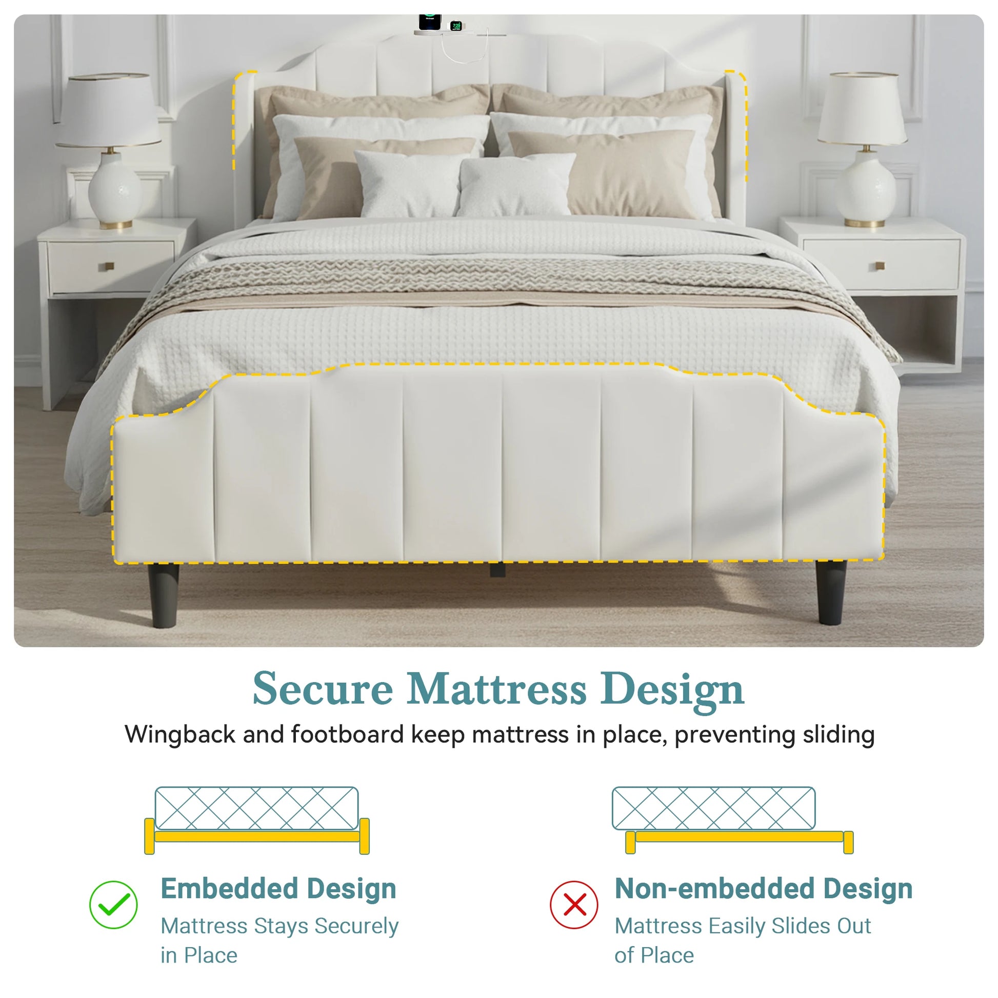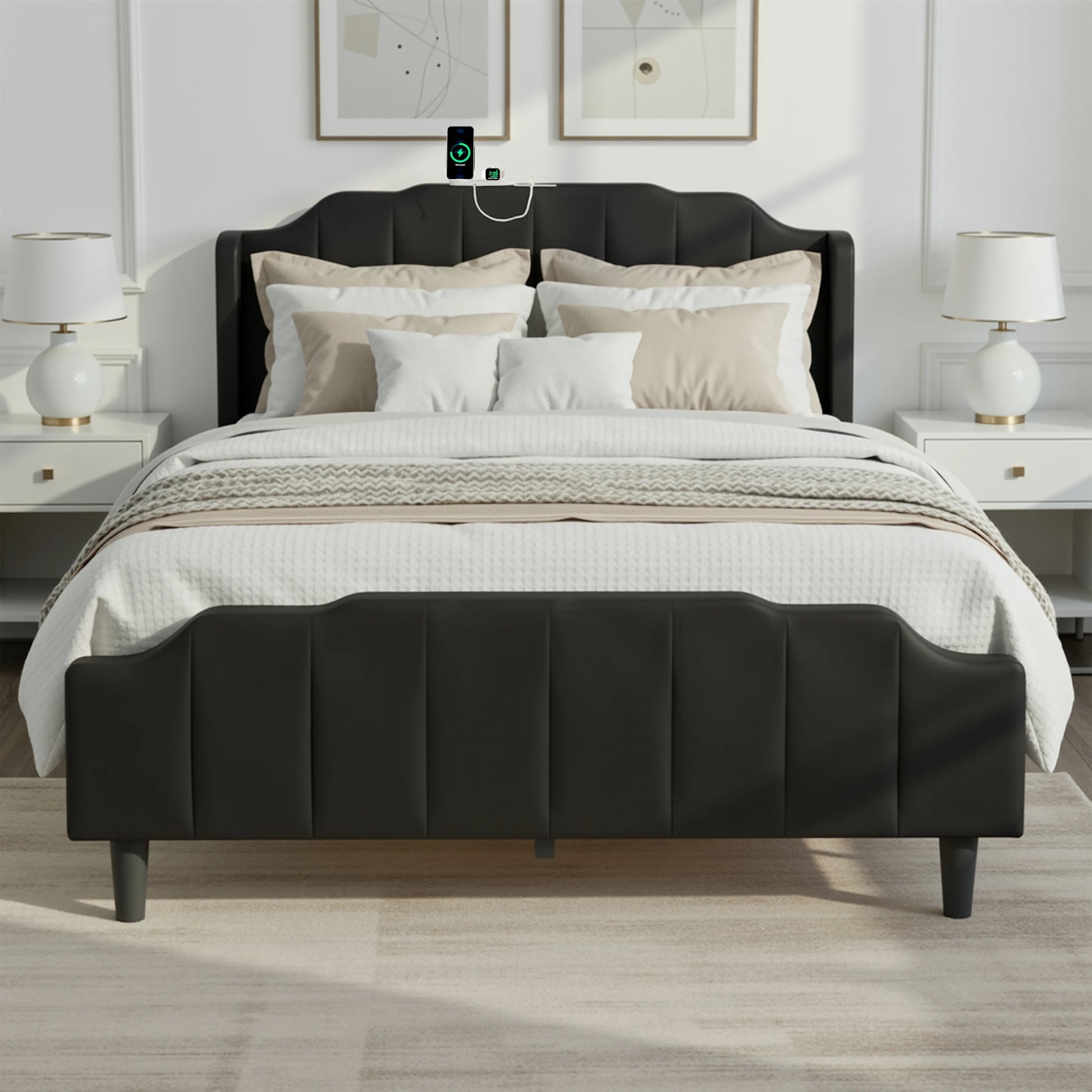Retro elegance meets modern convenience in a velvet platform bed with a curved wingback headboard and integrated charging station.