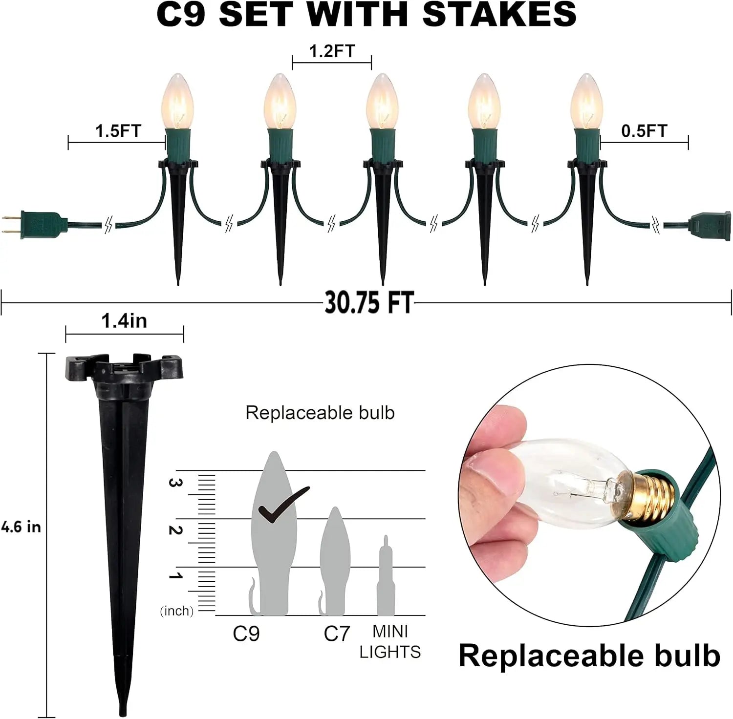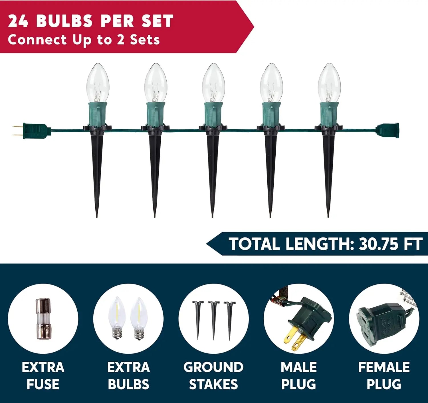 - 30.75 feet of warm white C9 bulbs come in a value pack of 24, giving you ample coverage to line walkways, fences, or garden borders.
