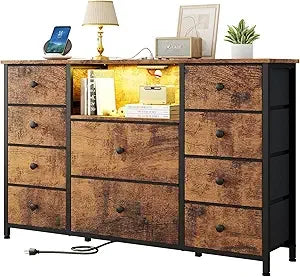 LDTTCUK Dresser with Charging Station and LED Lights, Long Dresser for Bedroom Dresser TV Stand with 10 Drawers, Fabric Chest of
