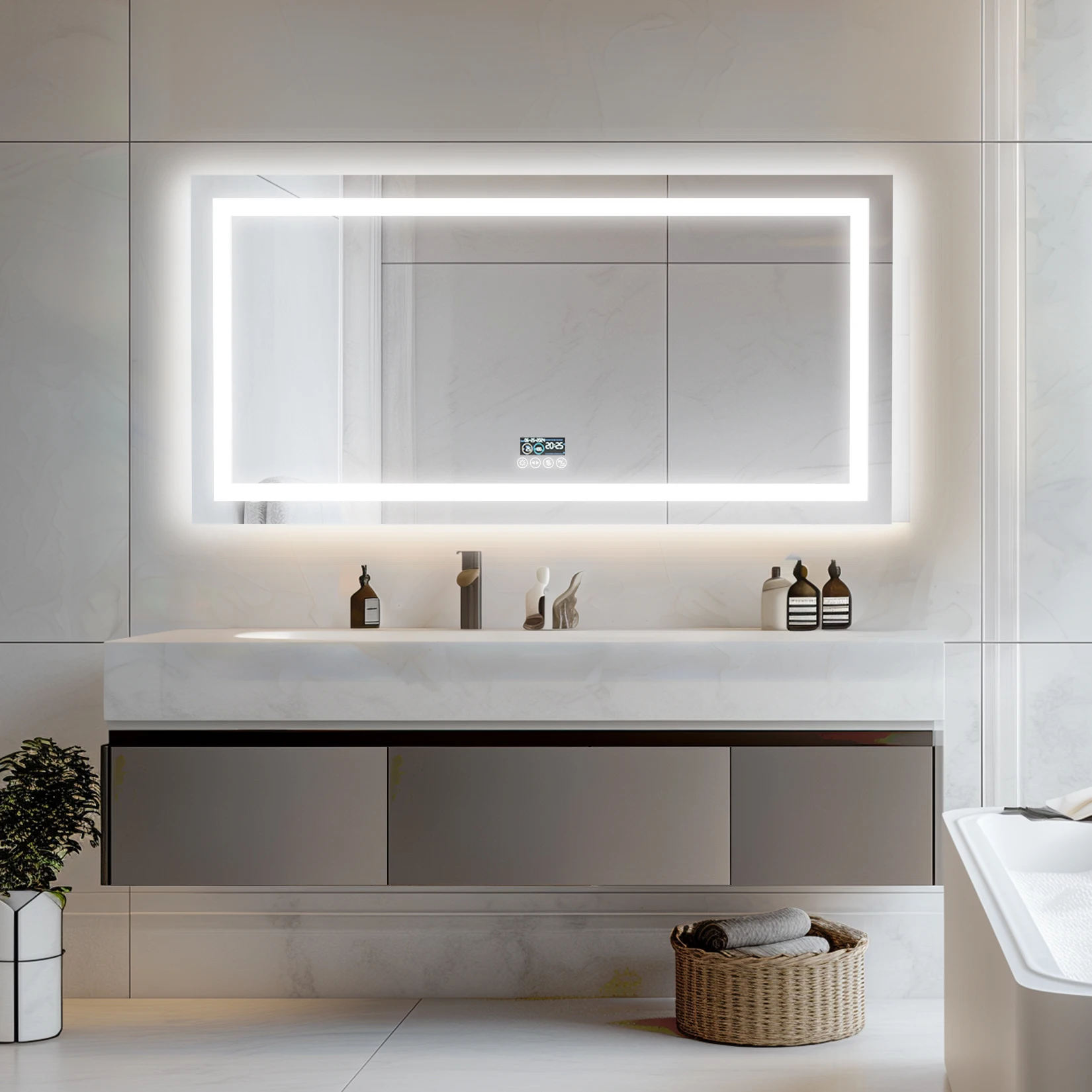 ăIntelligent DisplayăLUVODI bathroom vanity mirror is the first one to combine with dimming brightness, color settings, date and time, temperature, anti-fog, Bluetooth in one kind, you could know the time and temperature easily when you apply makeup or dress up, the mirror has dual led light strips, both front-lit and backlight, giving more illumination for makeup applications also creating ambiance, long press the button to steplessly adjust brightness from 20% to 100% according to your needs, it means that the pace of life is in your hands, enjoying more convenience with this smart mirror.