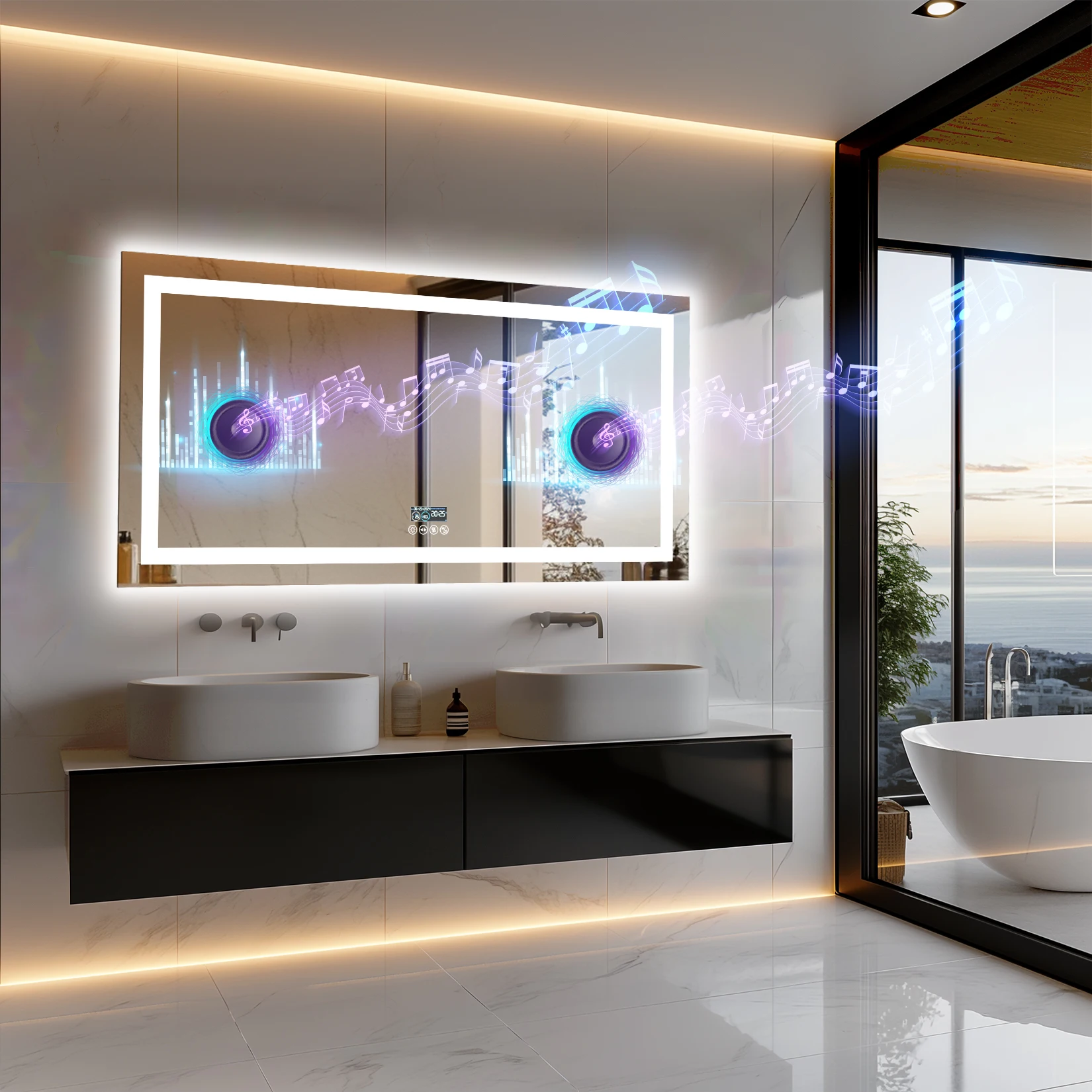 ăBluetooth SpeakerăIntegrating Bluetooth connectivity and NdFeB loudspeaker into this lighted bathroom mirror, which offers flexibility and more convenience, enabling users to stream favorite music or podcasts from smartphones when bathe or makeup in the morning, creating a more enjoyable and relaxing environment, NdFeB speakers provide high-performance audio quality, produce clear sound with minimal distortion, without unwanted noise, the combination of lighting and Bluetooth audio streaming features enhance user experience.