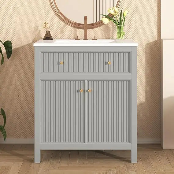 Transform your bathroom with a grey, 30-inch modern vanity featuring a fluted front and a white ceramic sink.