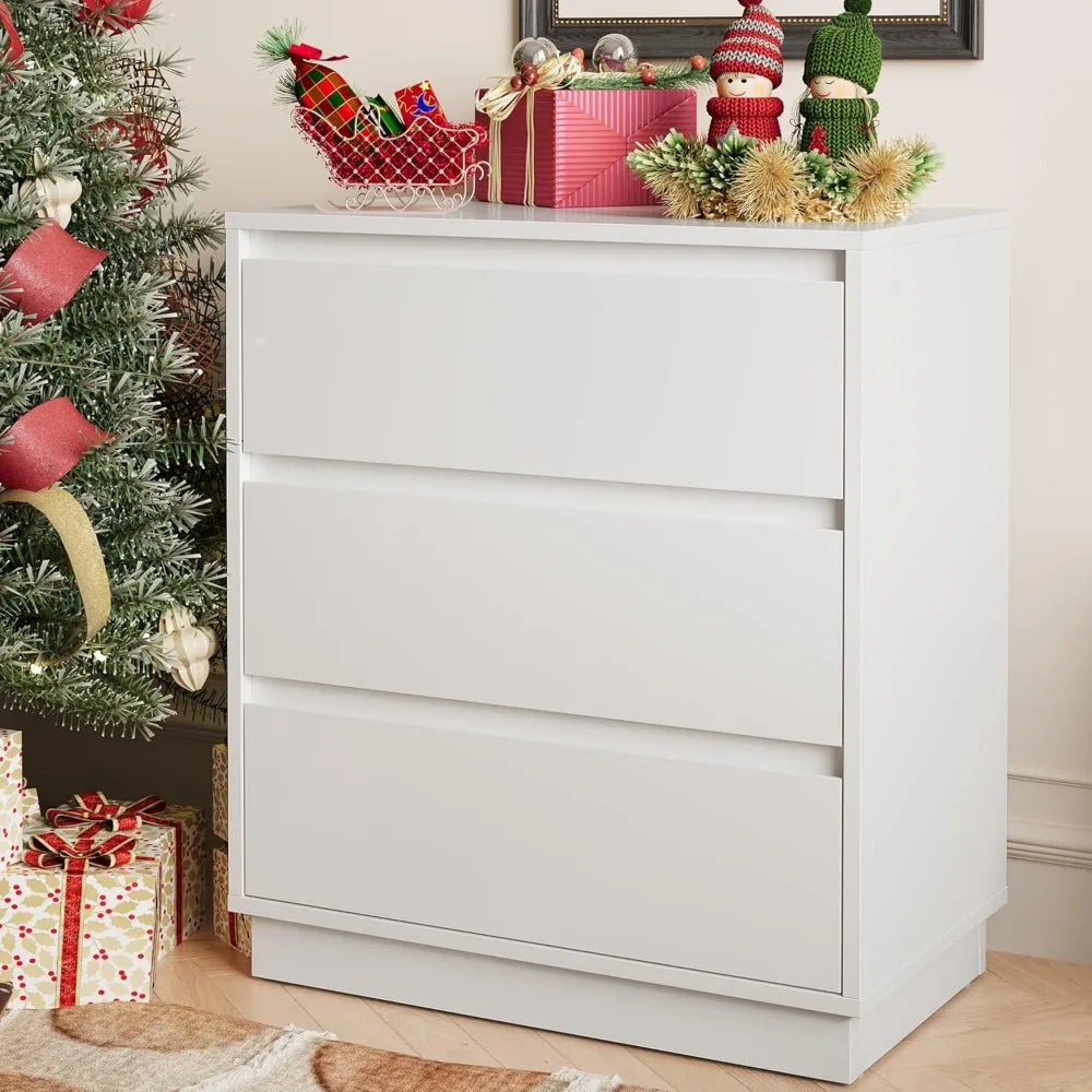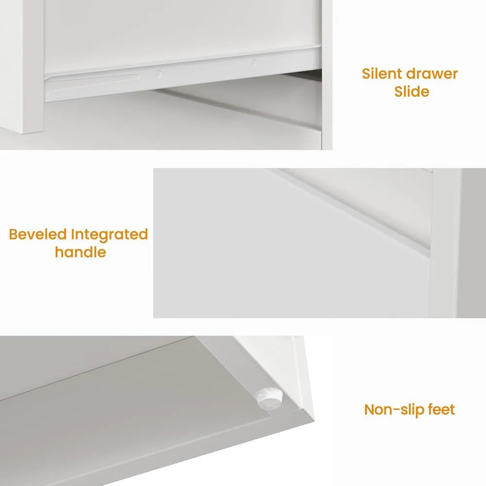 - The pure white, handle-free silhouette with hidden pulls delivers a calm, modern look that effortlessly complements your bedding and wall color.