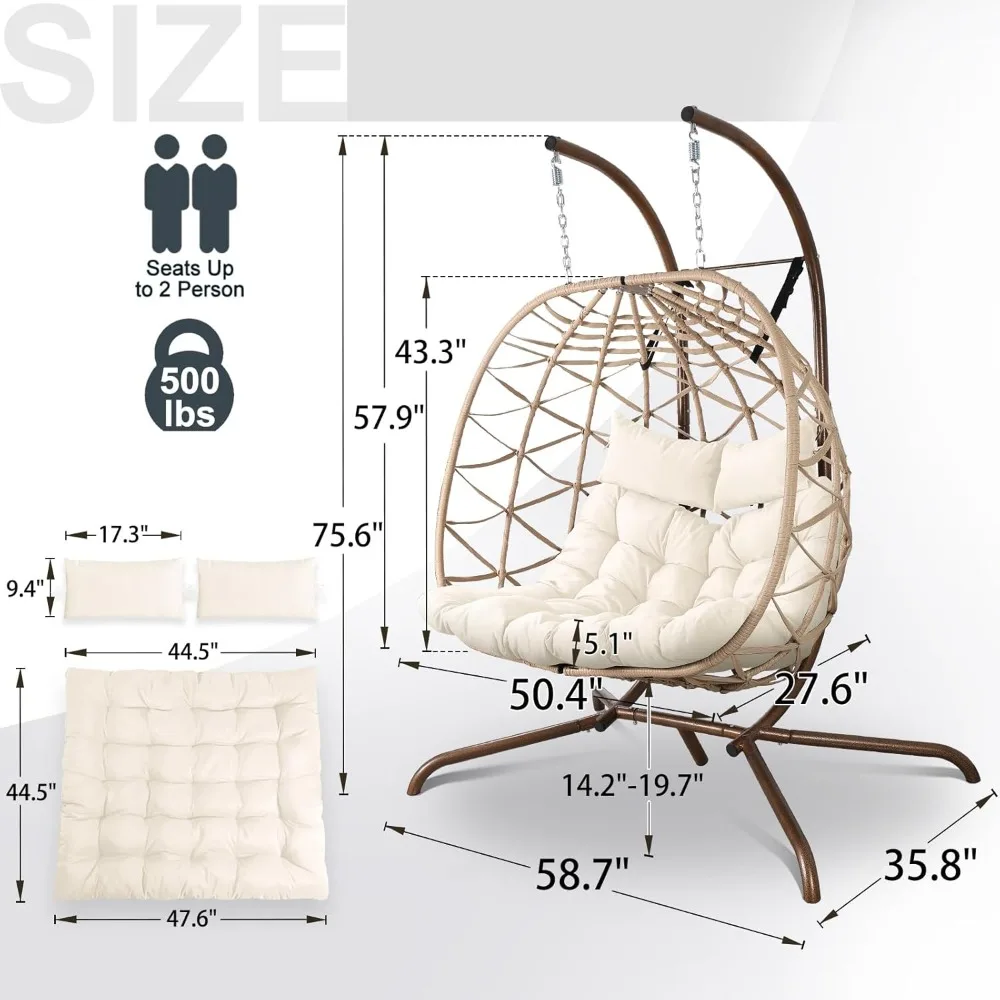 Outdoor Egg Swing Chair with Stand, 2 Person Patio Swing Chairs with Thick Cushions and Pillows, Wicker Double Egg Chair Swing