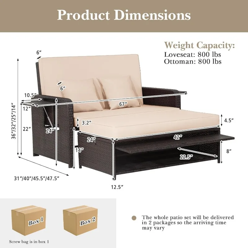 Patio Rattan Daybed, Patiojoy Wicker Loveseat Sofa w/Multipurpose Ottoman & Retractable Side Tray, 4-Level Adjustable Backrest, Footstool w/Storage, Seat & Back Cushion Included (Beige)
