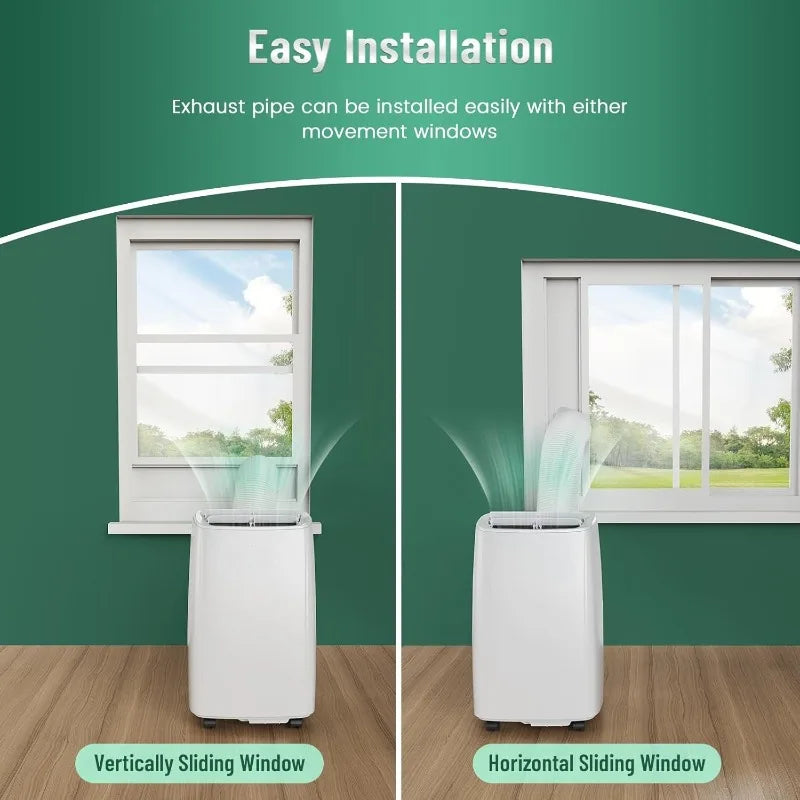 【ALL WINDOW KITS INCLUDED】:This portable air conditioner comes with all the materials you need, Includes exhaust hose, window panels, exhaust hose/window frame couplers, etc.So no additional assembly tools are required. And thanks to the fast connector humanized design,you can easily and successfully install it. It's also easy to move around into any room with handles & 4 x 360° castor wheels.
