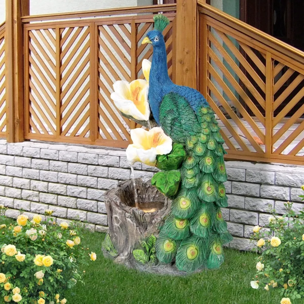 The waterfall floor fountain is made of poly resin and features a dazzling blue peacock with detailed tail feathers, creating a stunning water feature for your backyard. This outdoor fountain is designed to create a relaxing oasis, with water flowing gently down the petals. The garden fountain measures 12.2 by 9.8 by 22.8 inches, making it a perfect addition to your outdoor space. This fountain offers a blend of contemporary modern design and natural charm, providing the serene sound of running water as it flows down, imitating the sound of a real waterfall. It adds a peaceful ambiance to your home or yard with its Zen elements and nature-inspired charm. The tiered waterfall water fountain is suitable for various settings, including gardens, patios, and backyards. It can also serve as a beautiful housewarming, birthday, or new year gift for friends and family. The waterfall-style decoration kit comes with a separate pump and power adapter for easy assembly, allowing you to enjoy the DIY process before experiencing the relaxation of the fountain.