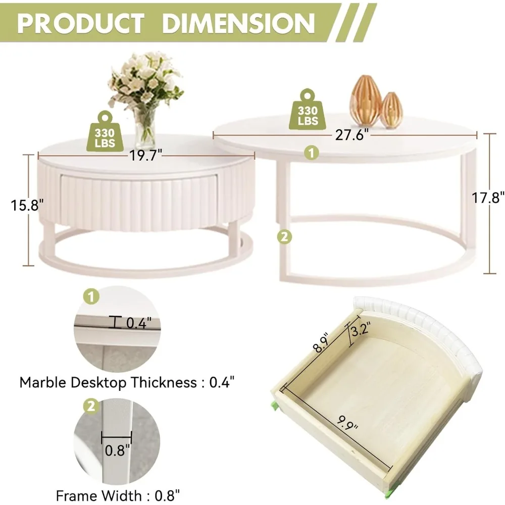 Stylish ExquisiteThe round coffee table combines a white marble tabletop with a beautifully embossed chest of drawers, the modern design is simple and stylish, exuding a noble and elegant artistic flavor. Whether in the living room, bedroom or office, it can easily enhance your home taste. - Flexible Space LayoutThe white coffe table contains 1 large coffee table and 1 small coffee table with flexible nesting design, which can be freely combined, separated or stacked according to the space requirements. No matter how big or small the space is, it can fit perfectly, helping you maximize the use of space and keep it neat and orderly.