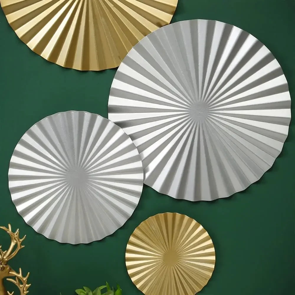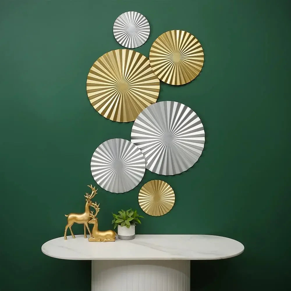 The gold and silver metal wall decor measures L-15.7, M-11.8, S-7.9 in inches