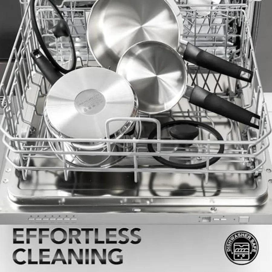 Effortless Cleanup: Stainless steel saucepan set is 100% dishwasher safe, saving you time and effort after every meal. Just place it in the dishwasher—no scrubbing or soaking needed. Enjoy stress-free cleanup.