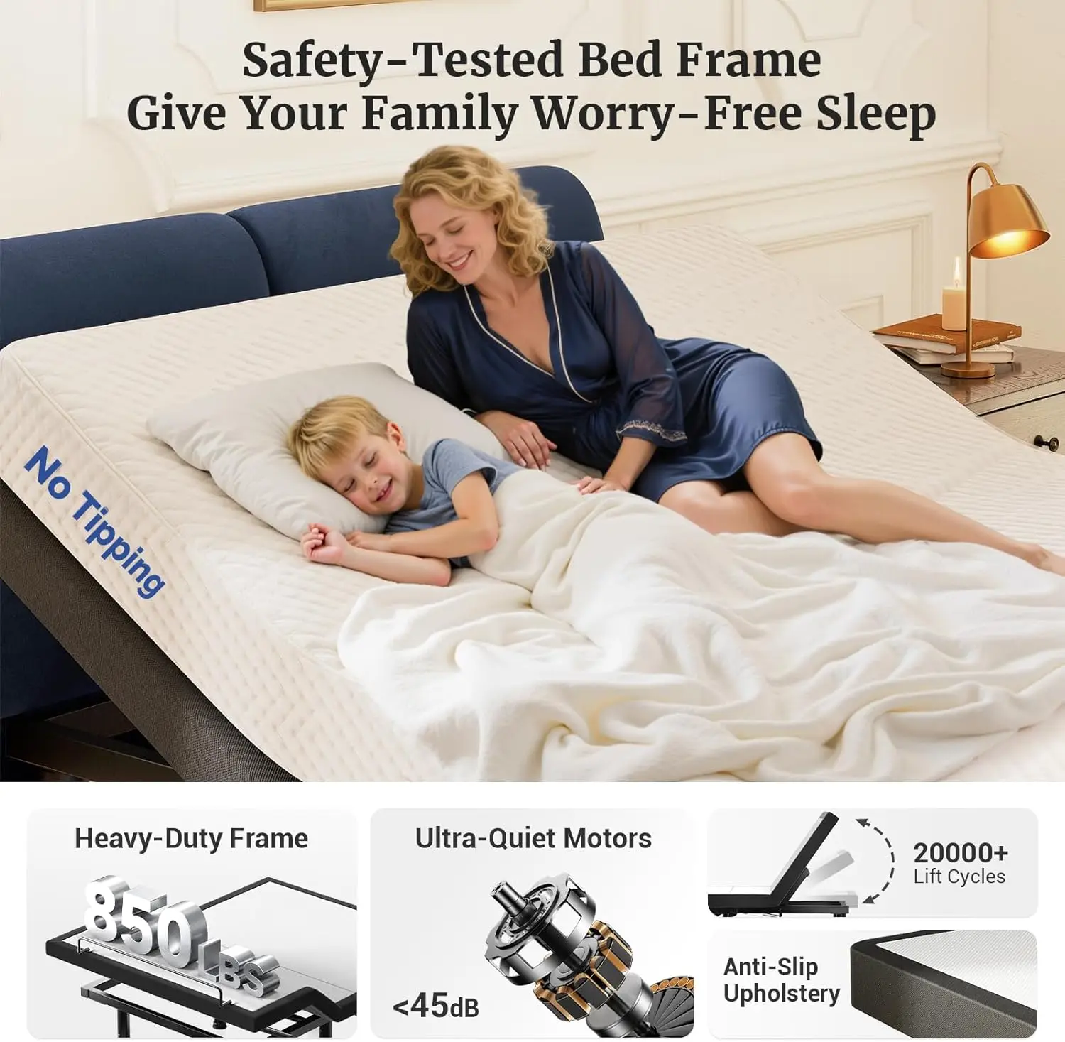 - EXCELLENT QUALITY: Adjustable bed featuring a sturdy steel frame and New Zealand 12mm E0 bedplate, max weight capacity up to 850 pounds. Dual motors adopt thick aluminum alloy tube, thrust up to 8000N, looping test 30000 times, operate sound less than 45 db