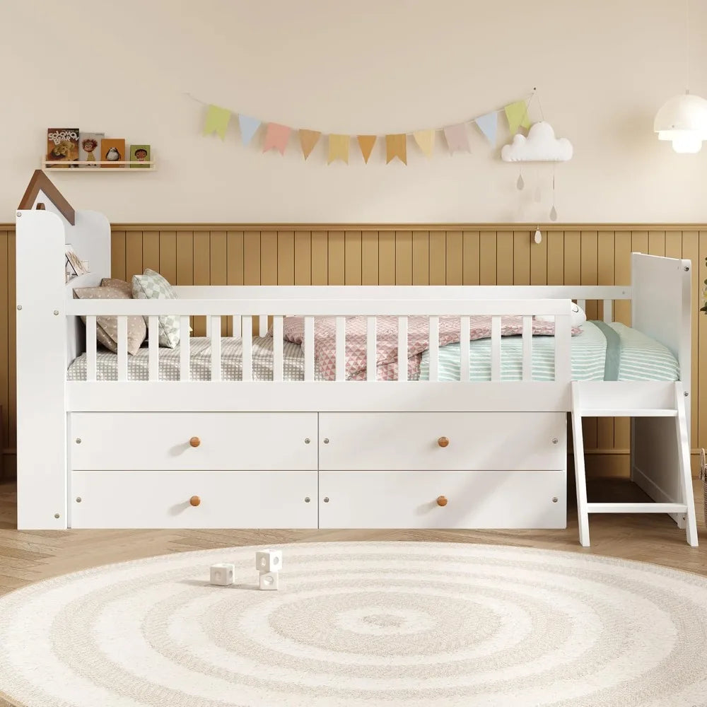 Platform Bed With House Headboard Guardrail and Four Storage Drawers