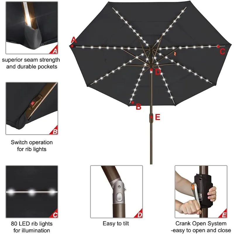 LED Lighting From the Sun: Dual switched hub light and 80 rib lights, more than most LED lights of patio umbrellas on the market. More rib lights provide a brighter view. Built-in rib lights are not easy to damage and aging. Powered by a solar rechargeable battery.