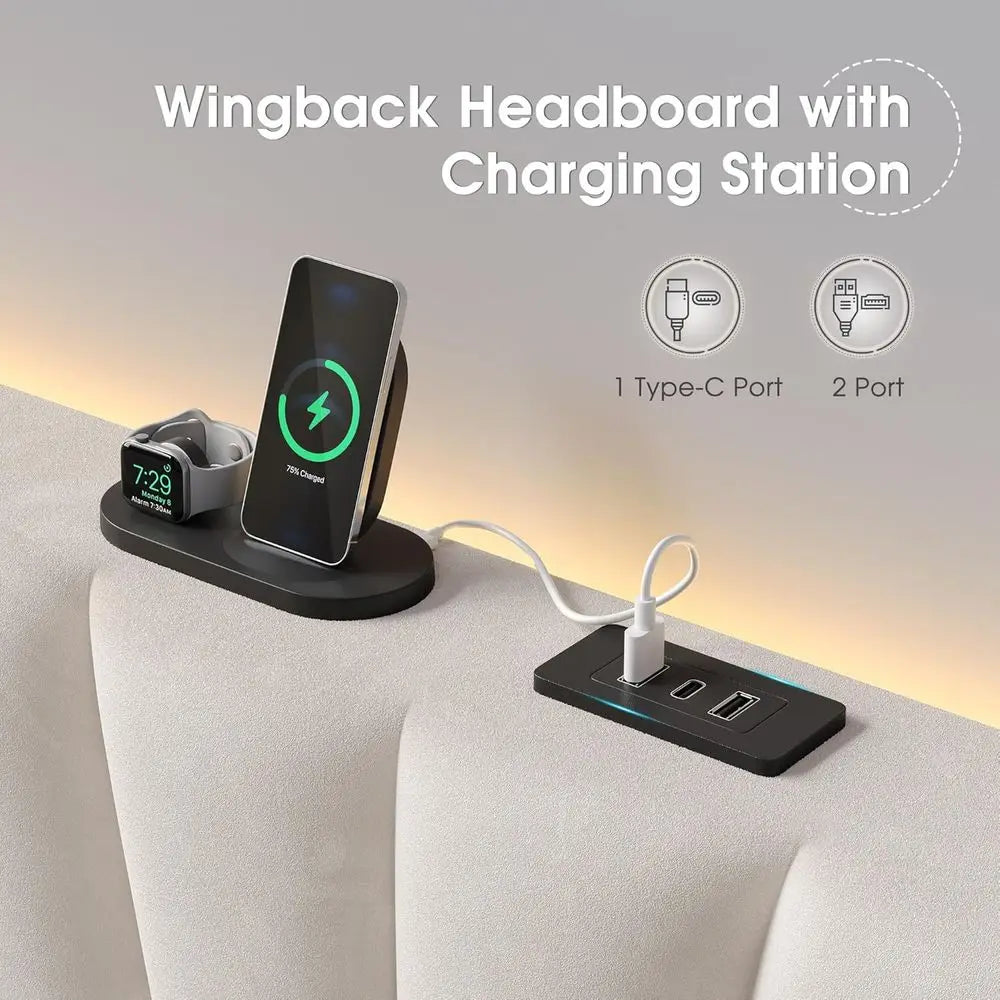 Transform your bedroom with a towering velvet wingback bed that brings you luxe comfort and modern tech.